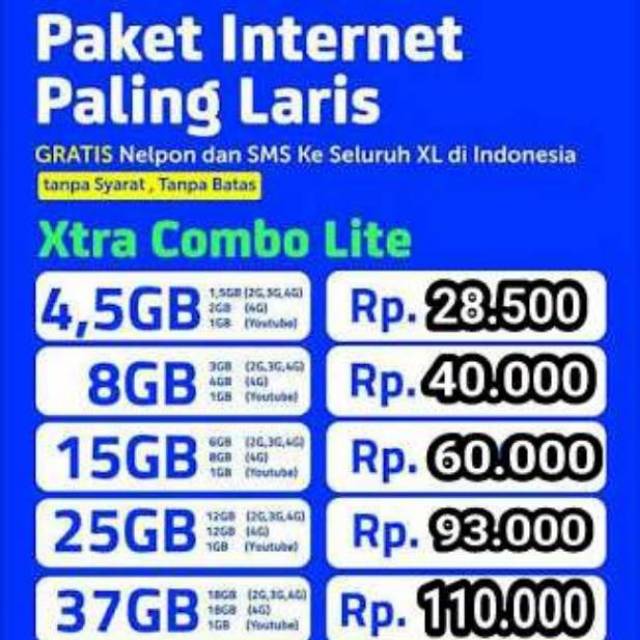 Xl xtra combo lite adalah paket data komplit yang ditawarkan oleh xl axiata, yang mana di dalamnya terdapat kuota internet 2g/3g/4g di jaringan xtra xl, xtra kuota lokal, xtra kuota.