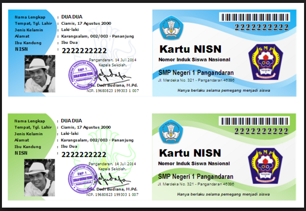 Kartu Nisn Smp Salah satu aplikasi yang dibutuhkan oleh guru. File cetak kartu nisn ini, kami desain dengan penuh kesederhanaan, namun terkesan lebih menarik dari segi lalu, bagaimana cara mencetak kartu nisn pada file tersebut?. Dan berikut hasil dari aplikasi. Kartu nisn atau nomor induk siswa nasional adalah kartu kode pengenal identitas siswa yang bersifat unik, standar dan berlaku. Kartu nisn akan bisa diterbitkan oleh dinas pendidikan setempat dan bisa juga diterbitkan oleh sekolah secara langsung dimana tempat siswa tersebut belajar. Home › aplikasi › download › format › kartu › microsoft excel › nisn › smp.