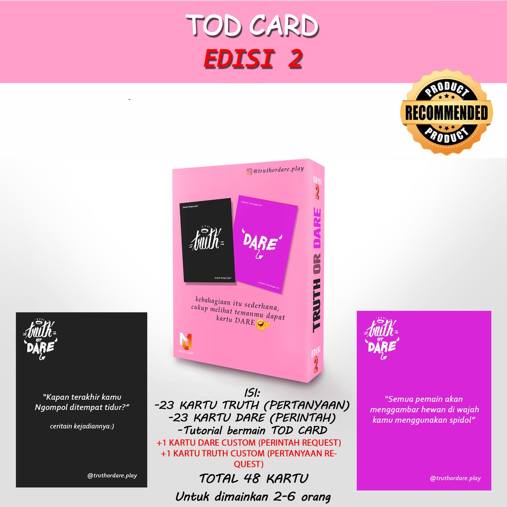 Kartu Tod Bank digital yang membuat anda selangkah lebih maju. Hallo semuanya, berjumpa lagi ada yang berani main ini? Kenalin nih permainan baru yaitu kartu truth or dare (tod card) edisi 1 ini permainan berbahaya karena banyak efek sampingnya, yaitu: Cari produk produk lainnya lainnya di tokopedia.